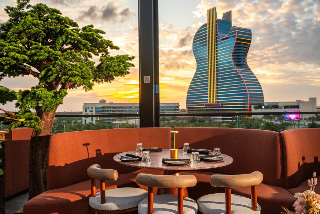 The moment you step onto this rooftop venue, you know you’re somewhere special. Panoramic views stretch across Hollywood as the sun sets. The Hard Rock’s iconic guitar glows in the distance.